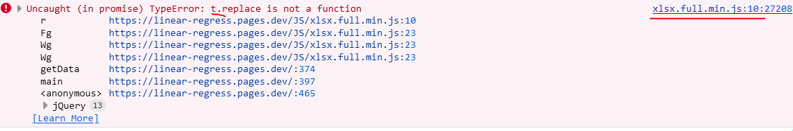 it was giving me this error message where it looks like "t" object was being miss-used inside "XLSX.full.min.js" because it failed to